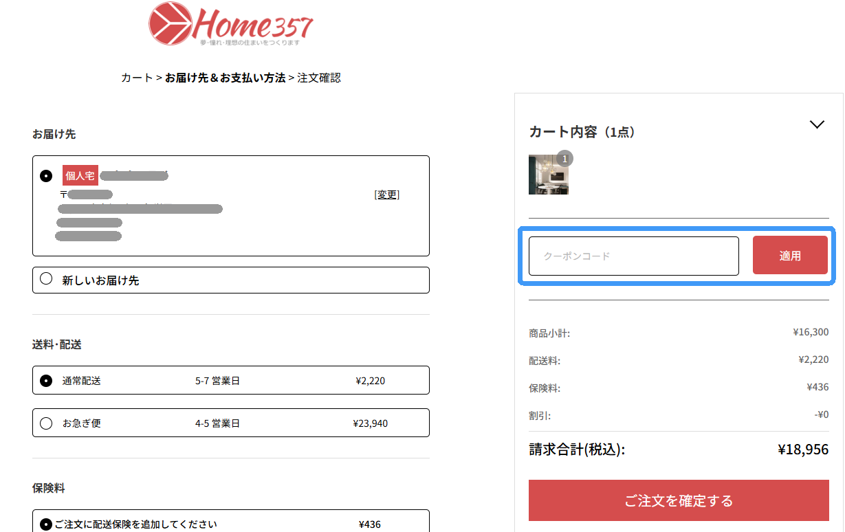 3.注文画面で、クーポンコードを入力して、注文を確認してください。